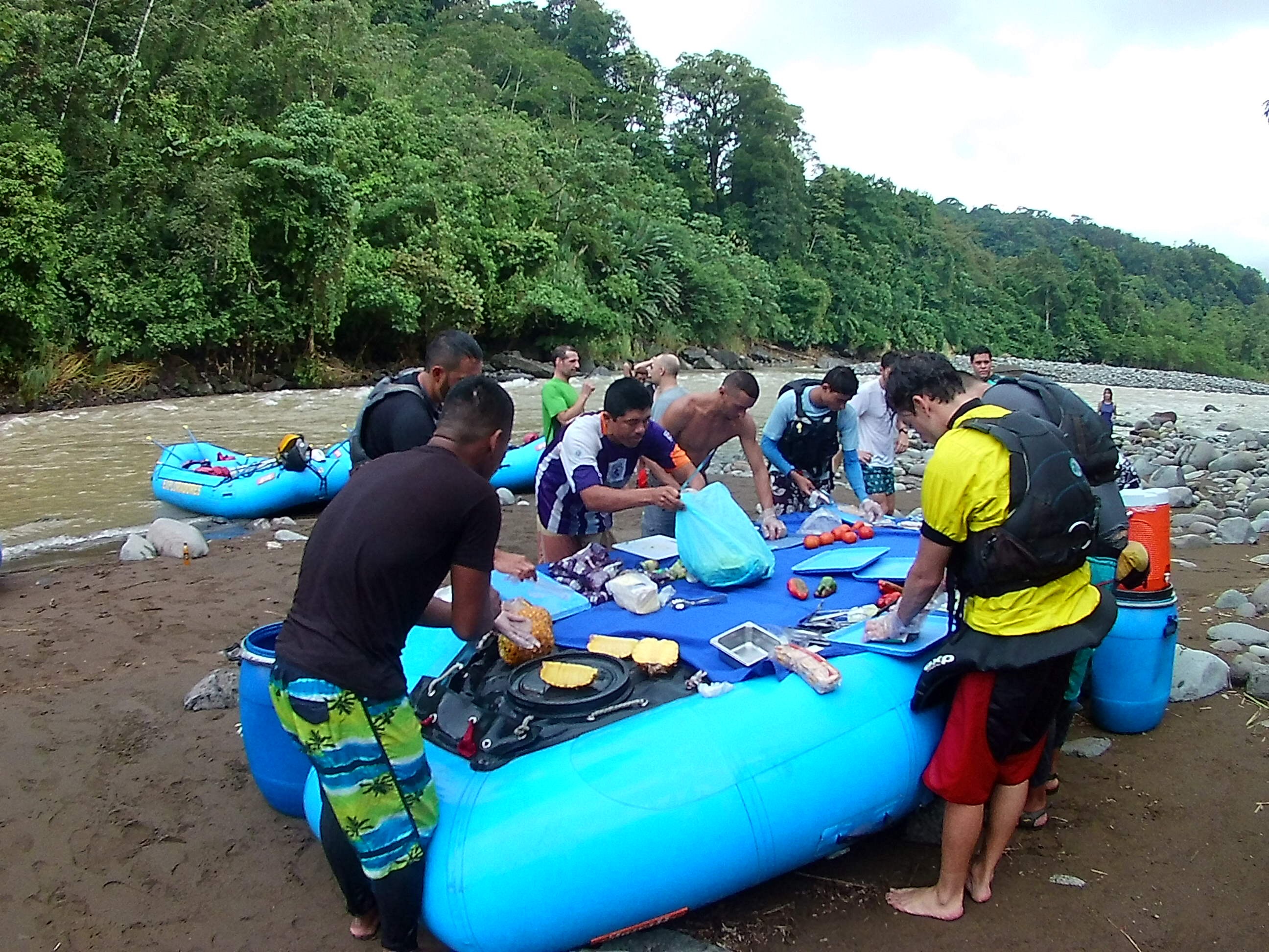 Chaitheamar 4 uair a chloig san iomlán ar an uisce agus chuireamar 40km taobh thiar dúinn sa slí seo. Bhí briseadh againn don lón ar bhruach na habhainn- rinne na treoraithe bord dá rafta agus d’ullmhaigh siad béile fajitas dúinn le glasraí úr. Bhí sé an-dheas bheith suite ar bhruach na habhainn i lár dufair Costa Rica agus béile breá lámhdéanta a ithe!