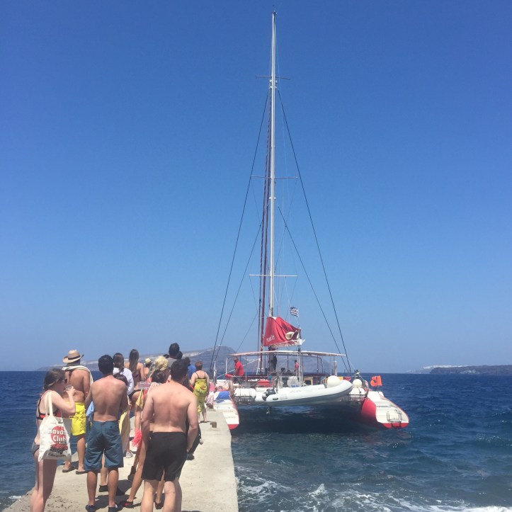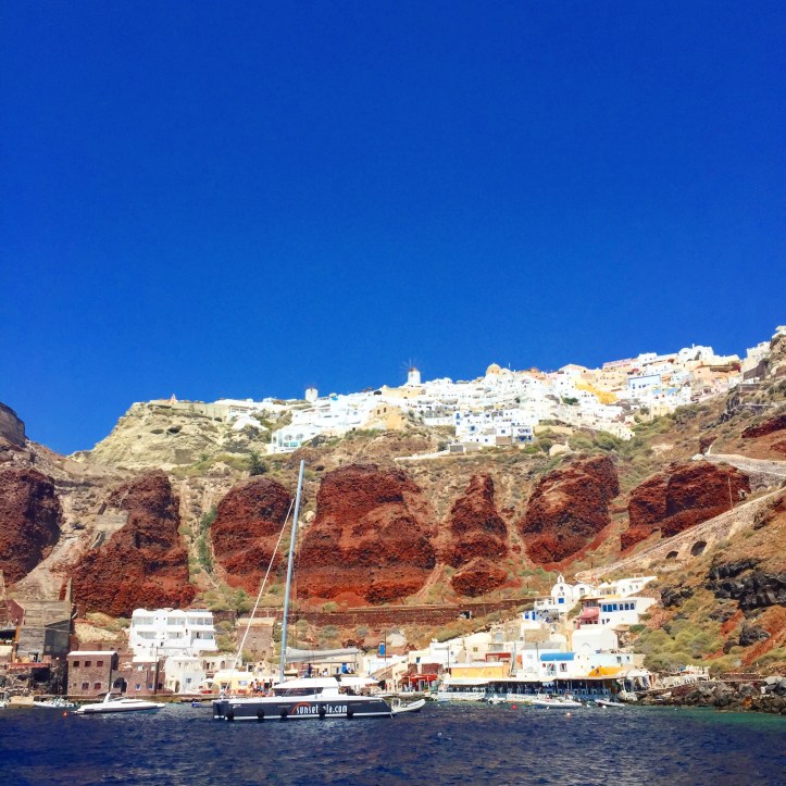 Más fearr leat roinnt ama a chaitheamh ar an uisce, is féidir dul ar thuras báid don lá- nó leath lá, agus na tránna agus bailte éagsúla a fheiceáil ón bhfarraige. Stopann an bád in aice le tránna difriúla agus is féidir léimt isteach san fharraige agus dul ag snámh san uisce breá úr. Feicfidh tú tránna bolcánach le gaineamh dubh nó dearg orthu agus gnáth tránna le gaineamh bán. Ag brath ar an bpacáiste a roghnaíonn tú, is féidir lón agus deochanna saor in aisce bheith agat le linn an turais álainn seo. Críochnaíonn an turas ag bun an bhaile Oia agus is féidir leat fanacht ansin don tráthnóna nó síob (saor in aisce) a fháil ar ais chuig do chuid lóistín. Bhaineamar an-shult as an turas seo; mhair an eachtra ar fad sé uair an chloig, agus bhí costas €100 air, ach b’fhiú go mór é, eispéireas iontach a bhí ann!