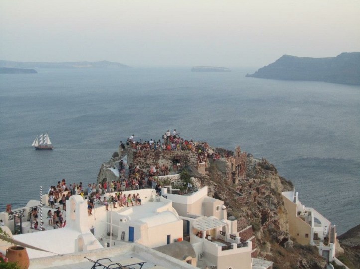 An rud is fearr le déanamh um thráthnóna ná dul go baile Oia nó Fira agus do scíth a ligint ann. Is féidir píosa siopadóireachta a dhéanamh nó suíochán a fháil i gceann de na beáir le radharcanna ann den chaildéara. Is áiteanna iontacha iad seo le féachaint ar luí na gréine thar an Muir Aeigéach. Déan cinnte dul ann luath go leor le suíochán a fháil agus deoch a ordú, ionas gur féidir leat fíor-shult a bhaint as an radharc dochreidte seo. Bíonn daoine an-tógtha leis an radharc seo agus is minic a thugann na sluaite bualadh bos mór don luí gréine agus é thart, amhail is gur seó nó taispeántas a bhí ann!