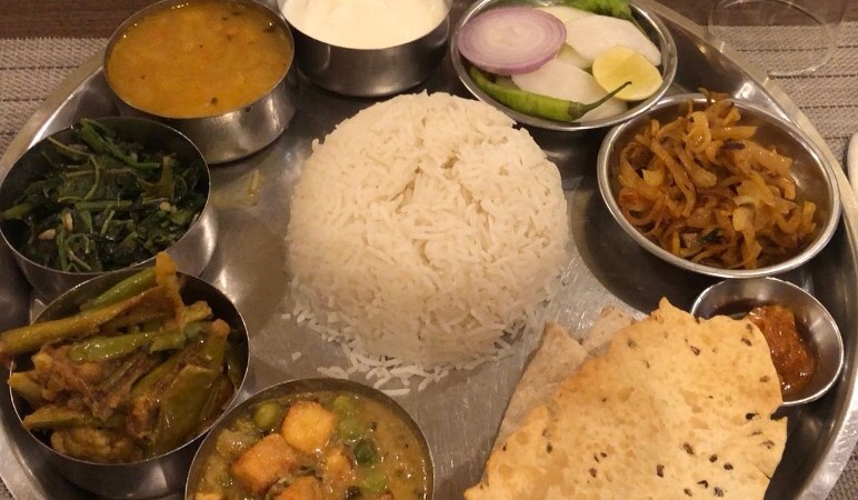 Thali– meascán de chúpla bia éagsúil. De ghnáth bíonn bia ar nós seo ann- rís, curaí le glasraí, duilleoga mustaird, prátaí cuimín (cumin), anlann lintile (lentil soup), agus taos spíosrach